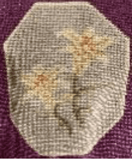 These The sacred symbols on the kneeler cushions at the Communion rail.